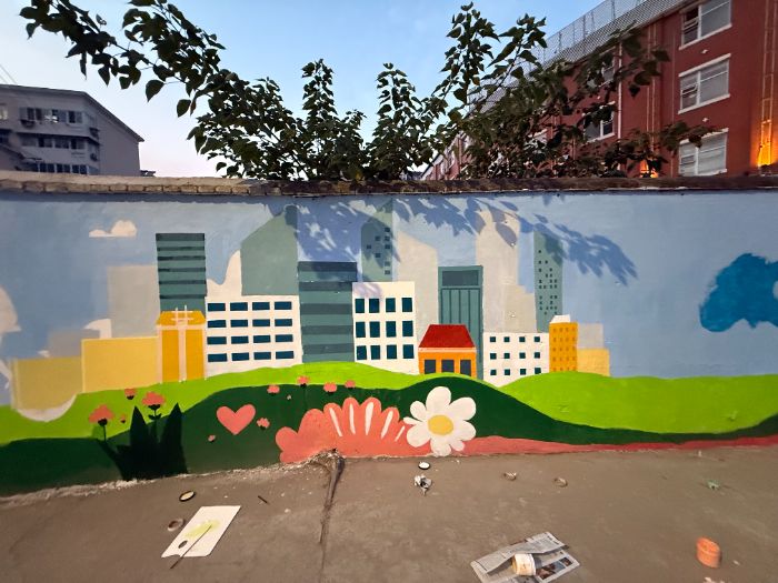 在宜昌市西陵区黄河路社区,斑驳墙垣前,实践队员变身“城市美容师”。烈日之下,调色盘与滚筒共舞,丙烯颜料将陈旧污迹覆盖。队员们紧扣社区文化基因,打造系列主题墙绘:葱郁山林与现代楼宇相融的“生态宜昌”画卷,让灰暗墙体蜕变成传播文明的“开放式美术馆”,引得居民驻足笑叹:“如今回家,就像漫步风景里!”