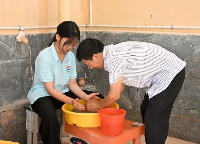 体验环节中,实践团成员们在左老师的耐心指导下尝试制陶。看似简单的转盘操作,实则考验着对力度、平衡与手感的精准把控。亲身体验后,大家才深刻体会到“台上一分钟,台下十年功”的含义——每一次捏塑的角度、转盘的转速、烧制的温度,都藏着左老师制陶多年的心得。