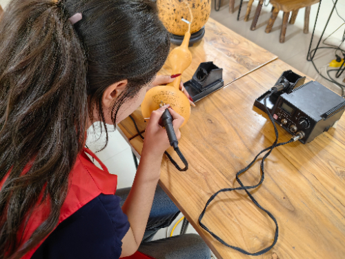 走进葫芦园,仿佛步入了一个“福禄”满堂的艺术殿堂。这里有二十余种葫芦品种,数百件彩绘、烙烫、雕刻作品静静陈列,诉说着一段段匠心独运的故事。石榴籽队行走在乡间小道,体会自然之美;通过动手实践,体验非遗魅力,感受着幸福村里的宝葫芦。由于葫芦皮的特殊质地,使得葫芦烙画的形式可以呈现出独特的质感与立体感,石榴籽队成员们用装有电热丝的笔状工具,以形态各异、大小不一的葫芦作为载体,通过调节温度和压力,体会葫芦烙画“易学难精”的学问。除此之外,石榴籽队成员们换上中华传统服饰,根据中药配方的不同功效,搭配并研磨中药香料,体验中药香囊的制作,感受中华文化的博大精深和中医文化的无限魅力。
