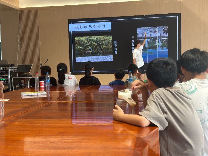 随后的课程重点介绍了多种实用构图技巧,如引导视觉焦点的“九宫格构图法”、展现稳定与庄重的“对称式构图”、创造动感与延伸感的“对角线构图”以及营造空间意境美的“留白构图”等。支教老师结合自己拍摄的照片实例进行讲解,引导孩子们观察画面布局之美。
