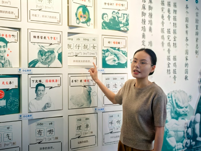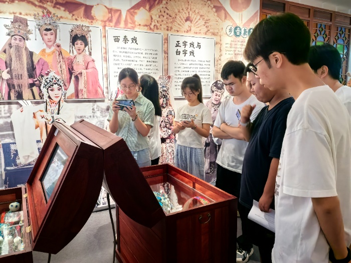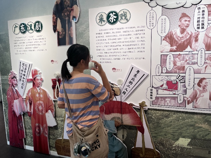 客家方言既是其日常交际用语,也是情感沟通与身份辨识的载体,更是认识客家文化的必由之路。展览从方言视角展现客家人族群面貌,围绕客家村落民居、婚葬礼俗、节庆活动、崇文重教传统及民俗故事等内容,凸显吃苦耐劳、刚强弘毅、团结奋斗的客家精神。客家语言艺术则涵盖客家山歌、山歌剧、广东汉剧、采茶戏、花朝戏、童谣及客家流行歌曲等形态。展区的墙上有形似电话的语音导览装置,实践团的成员将听筒轻靠耳畔,聆听戏剧唱段,领略客家语言艺术的独特魅力。