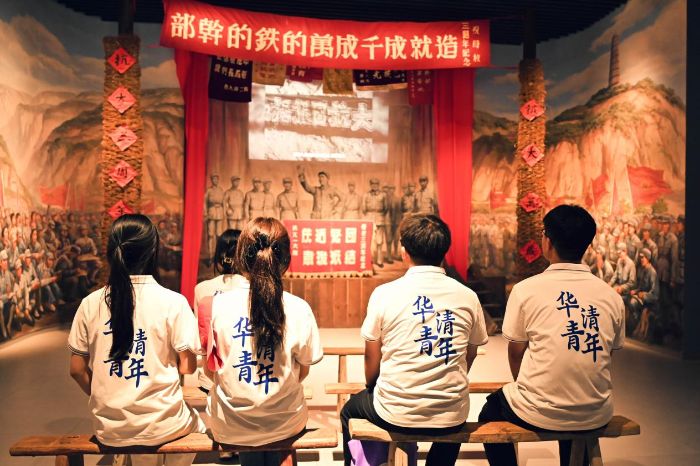 图为实践团成员坐在抗大长椅上体悟昔日会议场景。韩佳豪 供图