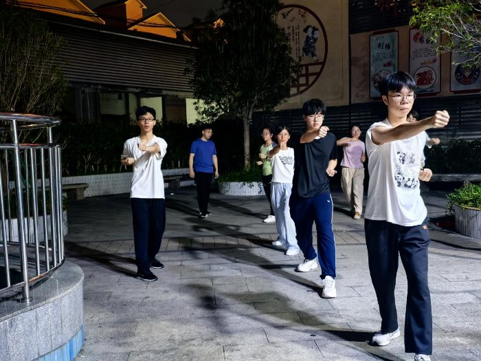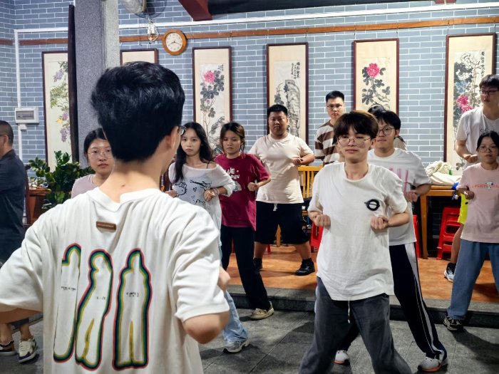 随后,黄师傅弟子江向宁教授基础招式。成员们从马步、冲拳学起,反复体会“中线理论”“以柔克刚”要义,在一招一式中感受传统武术的博大精深。