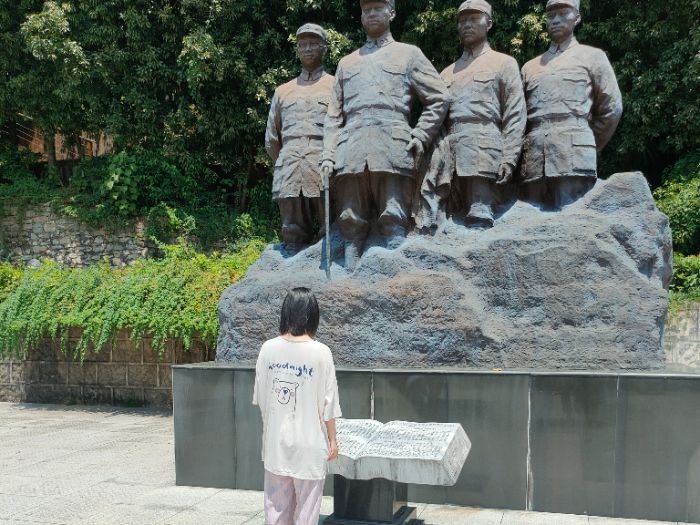青山埋忠骨,碑铭铸丰碑皖南事变烈士陵园坐落于泾县城郊的水西山麓,是新中国成立后为纪念皖南事变中英勇牺牲的新四军将士而建。实践团成员庄严肃立于陵园入口处的巨型纪念碑前默哀三分钟,表达对烈士们的无限敬仰和深切哀思,立志要将先烈们的革命精神内化于心、外化于行,努力学习科学文化知识,积极投身社会实践,为实现中华民族伟大复兴的中国梦贡献青春力量。高耸的碑体镌刻着“皖南事变死难烈士永垂不朽”十二个金色大字,在烈日下熠熠生辉。“1941年1月,震惊中外的皖南事变爆发,近7000名新四军将士用鲜血染红了这片土地。”
