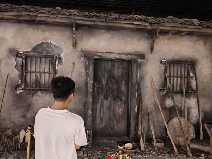 接着志愿者们又来到一处房子模型前,门口有枪、古朴的农具和草鞋等,门前散落的锄头、扫帚等工具,以及房屋可能作为农场或农田一部分的暗示,都展现了当时人们自给自足的农耕生活方式。这些工具不仅是劳动的象征,也是那个时代人们生存和发展的重要工具。门上的锁链和关闭的状态可能意味着在特定时期(如战争期间),为了安全起见,人们会采取措施限制外来人员的进入。这反映了当时社会的不稳定和安全意识的增强。该建筑所传达的历史感和怀旧感,能够引发人们对过去时代的思考和感慨。它让人们意识到战争的破坏力以及和平生活的珍贵,同时也唤起了对传统文化的尊重和怀念。