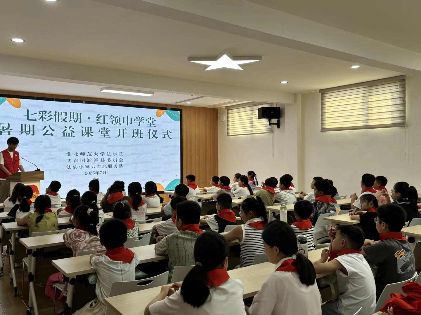 一.集结号角,梦想启程2025年7月7日,濉溪县“红领巾学堂”暑期公益课堂开班仪式在濉溪县青少年综合服务中心举行。法韵小喇叭志愿服务队的志愿者们早早抵达,精心布置活动场地。同学们怀揣着好奇与期待,有序入场。仪式上,团县委书记致辞,服务队负责人介绍安排,法学院老师讲话,助力青少年暑期成长。活动伊始,志愿者们给同学们戴上鲜艳的红领巾,当红领巾在胸前系好,那一抹红色映衬着孩子们纯真的笑脸,陪伴同学们开启一段充实且意义非凡的成长之旅。