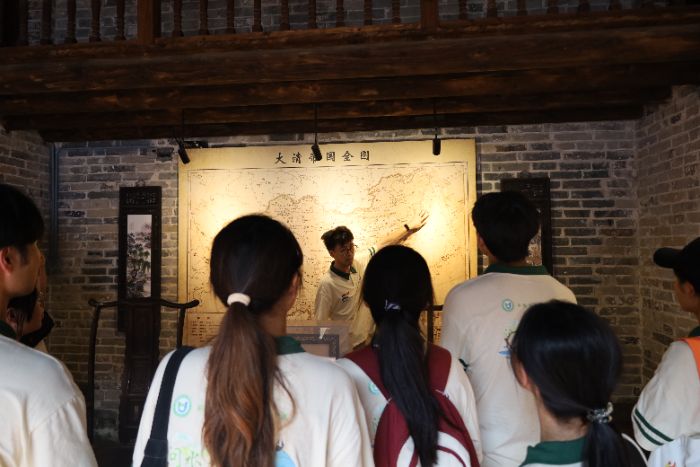 广州会馆:回望商贸往事,感知家国同频 广州会馆作为钦州市重要的红色文化地标,承载着厚重的历史记忆。步入会馆,古朴的建筑风格与丰富的历史展品相得益彰,仿佛将人们带回了那个风雨如晦的年代。这里曾是革命志士秘密集会、传递情报的重要场所,见证了无数仁人志士为了民族独立和人民解放而英勇奋斗的峥嵘岁月。墙上一幅幅珍贵的老照片、展柜里一件件饱经沧桑的文物,都无声地诉说着那段波澜壮阔的历史。实践团成员在参观中感悟到:“爱国从不是抽象的,无论是战场杀敌还是实业兴邦,都在用不同方式守护家国,这正是我们青年需要传承的担当。”