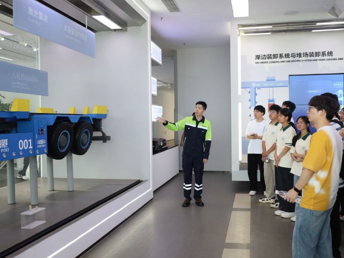 在沙盘与视频展示中,实践团成员直观了解到码头的硬核实力:如今,中国港口吞吐量稳居世界第一,北部湾国际门户港作为“一带一路”重要节点,创新采用全球首个U型工艺布局,建成全国首个海铁联运自动化集装箱码头,服务西部陆海新通道。