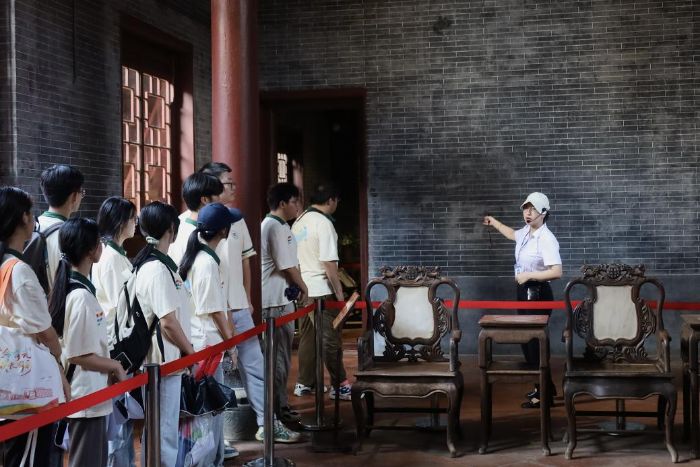刘永福故居(三宣堂)作为全国重点文物保护单位和国家级爱国主义教育基地,始建于清光绪十七年(1891年),是钦州市现存规模最大、保存最完整的清代建筑群。实践团成员在讲解员的引导下,依次参观了头门、二门、拒贿庭、请缨堂等核心区域,细致观摩了119间厅房内的壁画、木雕等艺术珍品,深入了解刘永福从反清义军领袖到抗法抗日民族英雄的传奇人生。