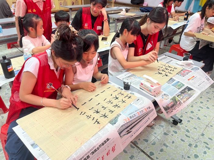突击队队员们以笔墨书香、楚河汉界、竹丝巧艺为桥,将书法的气韵、象棋的智慧与竹扇编织的非遗温度带进社区日常。他们手把手教孩子们提笔落墨、布局对弈、指尖编结,让传统文化的种子在孩子们心田扎根;同时以文化体验为媒,向社区孩子们讲述红色历史故事。这不仅让孩子们学会了笔墨传情、棋艺会友、竹丝寄意,更让红色基因在青春心中延续,以民族融合暖流与文化传承微光,共耀社区精神家园。