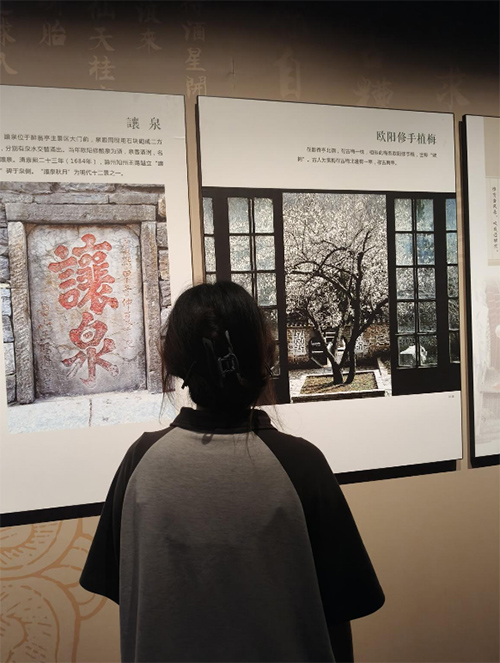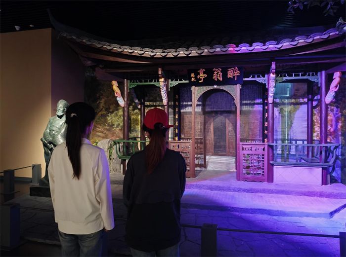 次日,调研重点转向“醉翁文化”与琅琊山。一座精细的1:10醉翁亭模型成为焦点,其飞檐斗拱与宋文物图案高度吻合。在“琅琊胜迹”影像墙前,学生们对比明代摩崖石刻拓片、民国古道照片与现代航拍图,观察石阶磨损与植被变迁。借助博物馆的数字资源,学生们虽未亲临实地,却对醉翁亭、古道石刻、深秀湖有了直观感受。多媒体阅览区内,他们整合首日文物与当天的数字资料,构建更系统的理解。