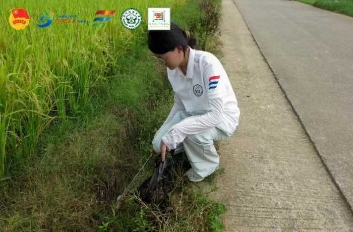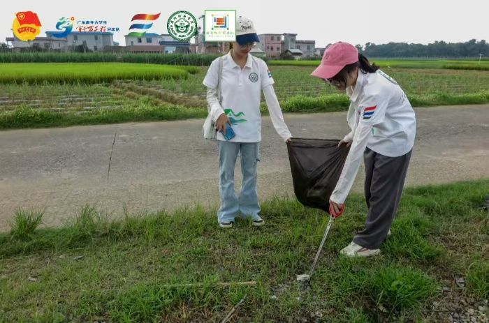 调研间隙,望着连片田园那承载乡村生机与希望的模样,实践队员决意以行动守护这份美好。队员们分组沿田埂、村道散开,手持工具细致捡拾塑料垃圾、废弃农药瓶等杂物。阳光炙热,汗水浸透衣衫,却挡不住队员们的热忱。近两小时俯身劳作后,村道和田边变得洁净整齐,田园在清风中更显清爽雅致,如拭去蒙尘的画卷重焕光彩。这不仅是一次垃圾清理,更是队员与乡村的深度对话。他们以双手拂去土地“伤痕”,彰显自然本真之美,更以行动践行青年对乡村振兴的担当,为美丽乡村画卷添上青春亮色。