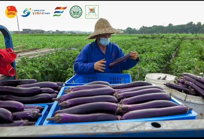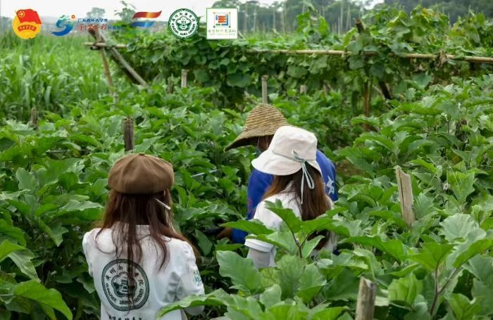 队伍继续前行,一片茄子地映入眼帘。饱满的紫色茄子挂满枝头,在绿叶的映衬下格外显眼。田垄间,一位伯伯正忙着采摘茄子,队员们便快步上前主动帮忙,一边麻利地将成熟的茄子放进竹篮,一边与伯伯拉起了家常。