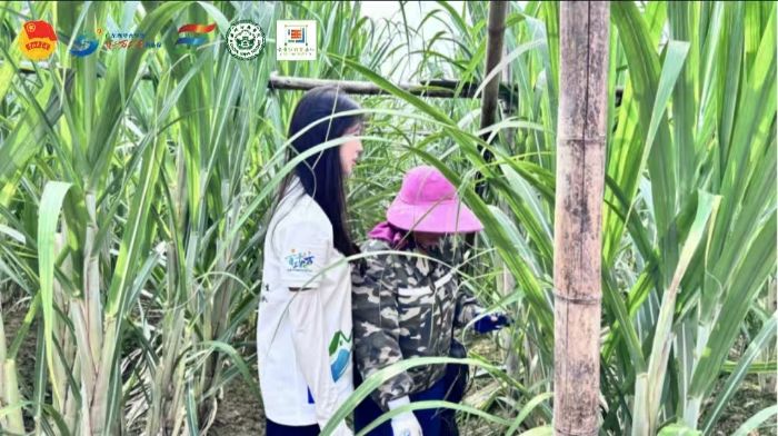 沿着村内道路继续前行,实践队员们来到了成片的甘蔗地。正在田间忙碌的阿姨见状,主动停下手中的活计,热情地向队员们介绍起甘蔗种植的相关情况。她表示,江古山村的土壤质地与气候特征,与甘蔗生长的需求高度契合,得天独厚的自然条件使得这里产出的甘蔗不仅甜度适口,品质优良,产量也始终保持在较好水平。