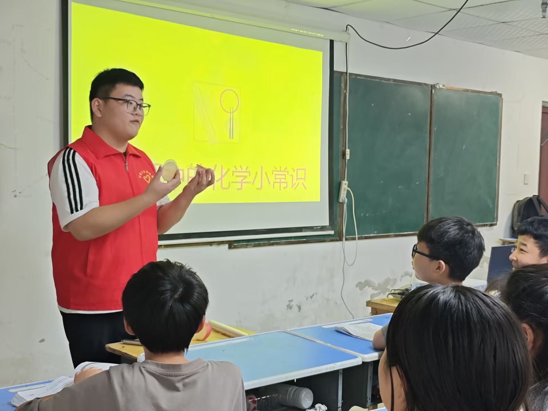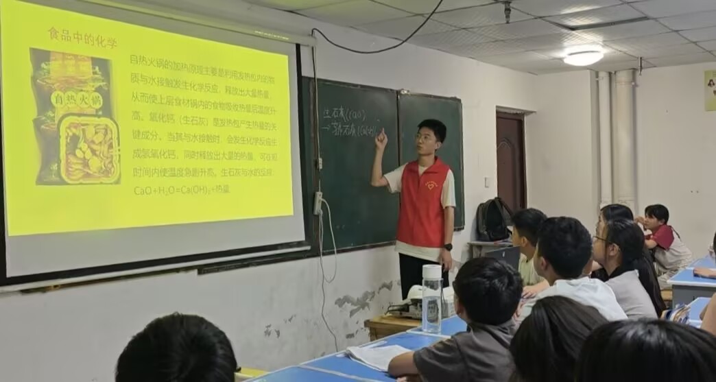讲解过程中,孩子们充满了好奇,纷纷提问:“为什么柠檬汁能让苹果不变黑?”“自热包里的东西是什么?”“蚊子包为什么会痒?” 面对孩子们天马行空的问题,实践团成员一一耐心解答,用简单的话语阐明背后的科学道理,进一步加深了孩子们对化学现象的理解和兴趣。