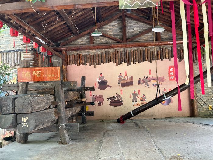 除主体建筑外,队员们也格外关注那些蕴含于细节中的营造智慧。木窗的格纹样式丰富多变,有的仿梅枝,有的似回纹,既保证了通风采光的基本功能,又暗含吉祥寓意;大门上方的门簪造型精巧,常雕刻着花卉、瑞兽等纹样,是屋主身份与审美情趣的体现。古寨在造景手法上的巧思更令队员们赞叹不已:废弃的老石磨盘被串联起来用作桥栏杆,既盘活了旧物,又透出浓厚的农耕文化底蕴;瓦片被错落有致地排列成景观墙,阳光照射下形成斑驳的光影效果;古树树干被匠心独运地改造成楼板的支撑柱,既保留了树木的生命印记,又使建筑与自然环境浑然一体。