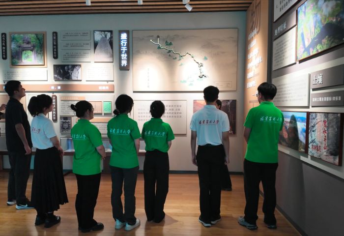 离开茶园,学员们来到燕子窠三茶统筹展示馆。展馆的玻璃幕墙映着远处的茶山,馆内以武夷山茶的历史、发展成就和规划为主线,像一本立体的茶书徐徐展开。拐角处的投影展现了武夷茶从古至今的发展历程,从神农尝百草时茶芽初绽的惊喜,到唐代煎茶的温润、宋代点茶的雅致,再到明清冲泡的闲逸,武夷岩茶在时光长河中不断蜕变。这片叶子跨越了千年的历史长河与我们相遇,它不仅是大自然的馈赠,更是武夷市人民致富的金叶。