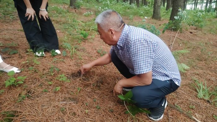 当日,实践队一行抵达红旗林场后,便受到了林场工作人员的热情接待。随后,在林场技术员的带领下,队员们走进红松林区。技术员首先为队员们讲解了土壤对于红松生长的重要性。他介绍道,红旗林场的土壤属于典型的寒地黑土,其土层深厚、腐殖质含量高,为红松生长提供了丰富的养分。“红松生长缓慢,对土壤肥力和透气性要求极高,咱们这片黑土地的特性恰好满足了红松的生长需求。”技术员一边说着,一边蹲下抓起一把土壤,向队员们展示土壤的质地与色泽,并详细解释土壤成分与红松生长的关联。