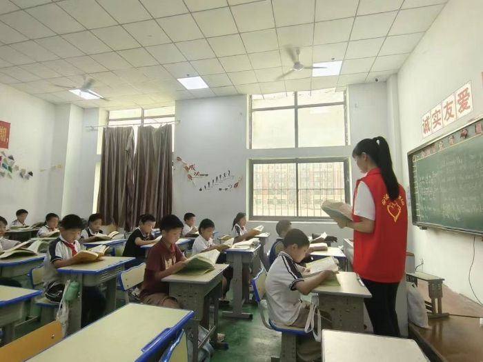 活动一开始,实践队员以“为什么要读书”为切入点,向孩子们阐述阅读的重要性。实践队员们提到,阅读是获取知识最直接的方式,就像为大脑“充电”,能让我们了解历史故事、探索自然奥秘、认识世界各地的文化。“当你读《昆虫记》,就像跟着法布尔走进昆虫的世界;读《西游记》,仿佛和孙悟空一起踏上取经之路。”实践队员们用生动的比喻来解释其重要性,直击人心,引发孩子们的共鸣。