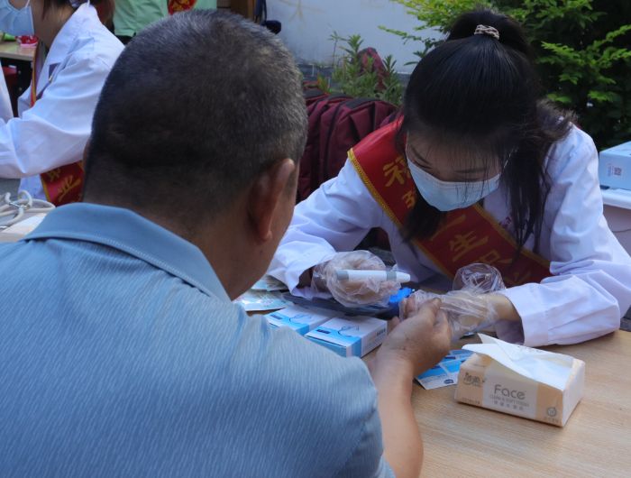 图为实践队队员为村民测量血糖画面。项荣春 供图