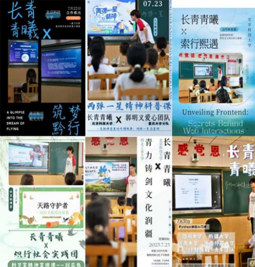 三、协同聚力 长青青曦实践团深知单打独斗力量有限,积极寻求外部合作,搭建资源共享平台,致力于扩大影响力和可持续性。我们成功与北京科技大学、厦门大学、四川大学、新疆大学、济南大学、海南师范大学、西北工业大学、南京航空航天大学、重庆大学等国内知名高校的优秀实践团队建立了紧密合作关系,目前完成6节云支教合作课程。团队也设计并制作对应6张高质量精美合作海报。海报主题鲜明,设计精良,既用于活动宣传预热,也用于成果展示汇报,有效提升了团队的专业形象和项目的视觉吸引力。