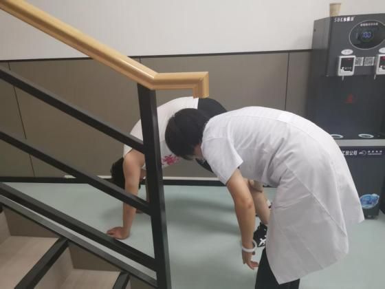 清晨的空气愈发清新,门诊大厅里同学们跟随着老师对脑梗偏瘫患者进行各个方向的主动运动训练中的抗阻力训练;对蹲起困难的患者进行大腿后侧肌肉的拉伸和放松,增大踝背屈的关节活动范围。物理治疗室内,同学们帮助偏瘫患者进行Bobath握手,一点点指导着患者进行训练,不断纠正患者存在的问题。