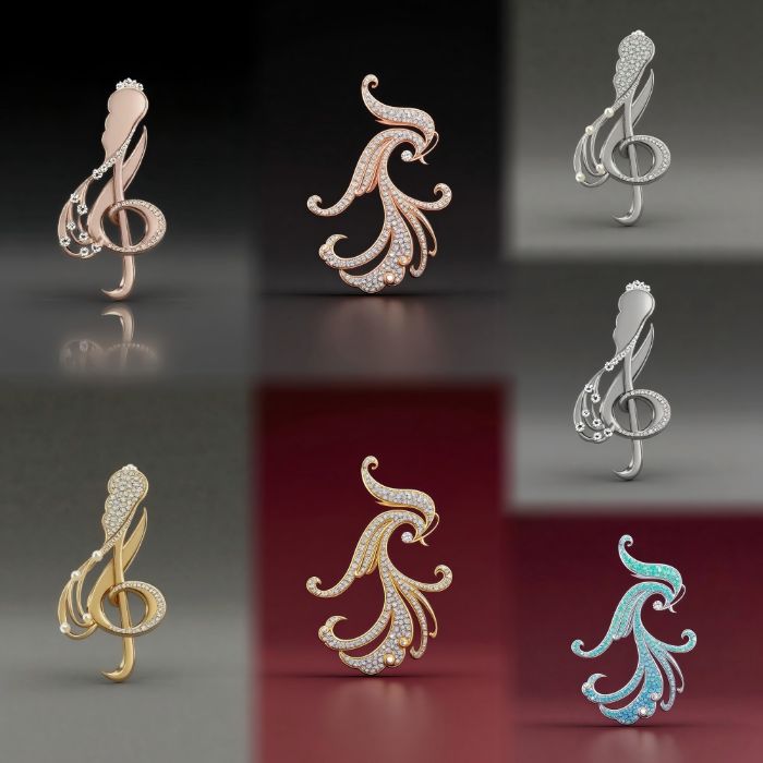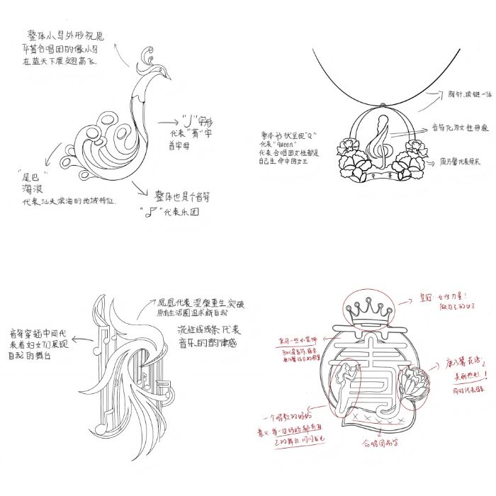 与此同时,实践团队结合自身于艺术设计领域所具备的专业优势,为华文社区“华菁合唱团”设计主题胸针。实践团将凤凰涅槃、海浪奔涌等意象与音乐艺术有机融合,创新采用“华菁”首字母“J”与音符、皇冠等元素进行艺术化重构。经由与合唱团成员共同商讨并优化设计方案,最终确定了两款具有代表性的设计方案。其一,以凤凰寓意“重生超越”,将“J”与音符进行结合,凤凰的羽翼幻化为海浪,与当地地域特色相契合;其二,以女性背影作为胸针的轮廓,其中暗藏高音谱号与字母“J”,顶部的皇冠象征着自主信念,发尾的波浪则呼应了当地的地域风情。两款胸针最终成为承载合唱团文化记忆、凝聚团队共识的立体化精神图腾,为社区文化建设注入青春创意与文化活力。