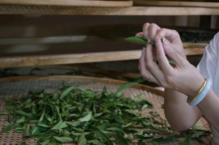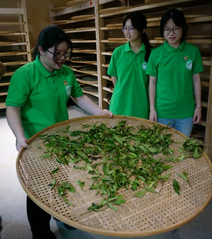 最让成员们兴奋的是摇青工艺的亲身体验环节。在老师傅的示范下,大家两人一组,分站在竹制摇青筛两侧,双手握住筛沿,按照“轻摇、重摇、复摇”的节奏协作转动。“摇青时要讲究力度和频率,既要让茶叶边缘相互摩擦促进发酵,又不能损伤叶片。”老师傅手把手指导着发力技巧。成员们在反复练习中逐渐找到感觉,听着茶叶在筛中碰撞发出的簌簌声,感受着叶片在力道作用下的细微变化,真切体会到“看青做青”这一传统智慧的精妙。看似简单的摇青,实则是决定茶叶香气和滋味的关键一步,每一次转动都凝聚着制茶人的经验与匠心。