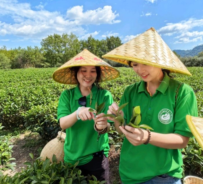 体验的最后一站,实践团来到茶叶厂的专属茶园。戴上斗笠、挎上茶篓,成员们化身茶农,走进郁郁葱葱的茶树间,学习“一芽三叶”的采摘标准。看似简单的采摘动作,实则十分考验耐心和技巧。烈日下,大家穿梭在茶垄中,不一会儿便汗流浃背。通过亲身体验,成员们深刻体会到每一片茶叶背后都凝聚着茶农的辛勤付出,也更加珍惜手中的每一杯茶。