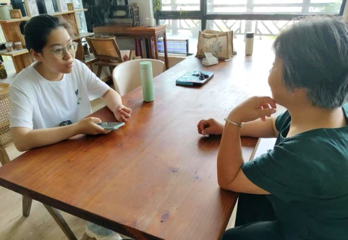 图为走访咖啡店,与店主交谈,唐铭遥、冯欣艺摄