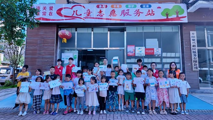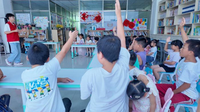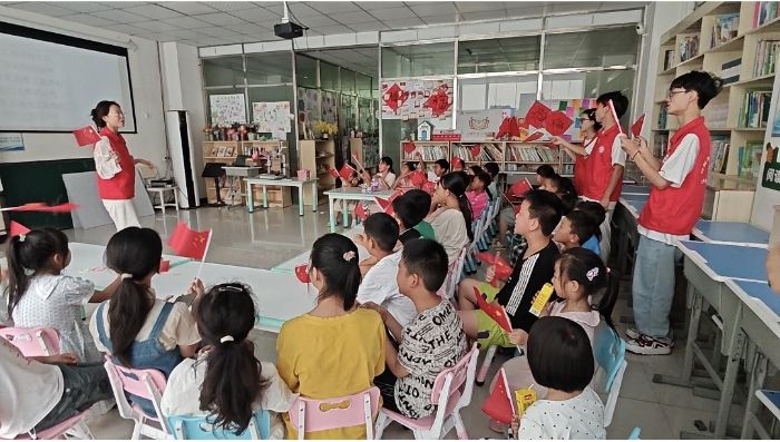 "3D未来筑梦实践团"的队员用行动解释红色文化,当《红星闪闪》前奏从蓝牙音箱流淌而出,队员指尖扫过吉他琴弦:“红星是什么颜色的?”“鲜血染红的!”八岁的小朋友抢答,童声未落,整个服务站已被稚嫩而铿锵的合唱淹没。孩子们高举手里拿着的五星红旗如破土新芽,唱出了时代的新生力量!