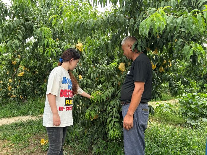 在了解完村委的发展变化后,8月1日,团队成员来到当地农田,拜访了几位种植阳山水蜜桃的农民。农民们热情地向队员们分享了种桃的心得体会。阳山水蜜桃以其肉质细软、汁多味甜而闻名,但其种植过程并不简单。一位经验丰富的桃农表示,水蜜桃的种植需要精心呵护每一个环节。从土壤改良、品种选择,到施肥、修剪、病虫害防治等,每一步都关乎水蜜桃的品质和产量。例如,在施肥方面,要根据不同的生长阶段合理搭配有机肥和化肥,以保证桃树有充足的养分;在修剪时,要根据桃树的树形和生长情况,去除多余的枝条,保证通风透光,提高果实的品质。此外,桃农们还分享了应对自然灾害和市场变化的经验,提醒队员们在农业生产中要注重风险管理和市场调研。
