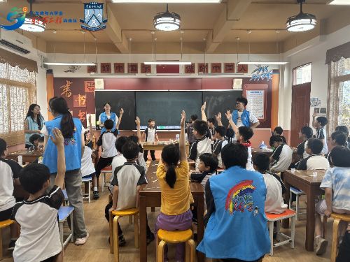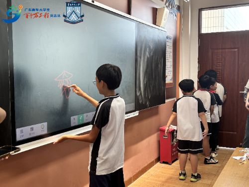 实验间隙,“你画我猜”的互动游戏让课堂气氛推向高潮。助教老师MC老师给出几个词语,每组依次派出五名学生接力传递信息。第一个学生在黑板上画下图案,第二个学生用手比划动作,直到最后一位学生回答出答案,全组欢呼着击掌,学生们的笑声交织在一起,成了课堂里最动人的背景音 —— 那是属于探索之外的、纯粹的快乐。
