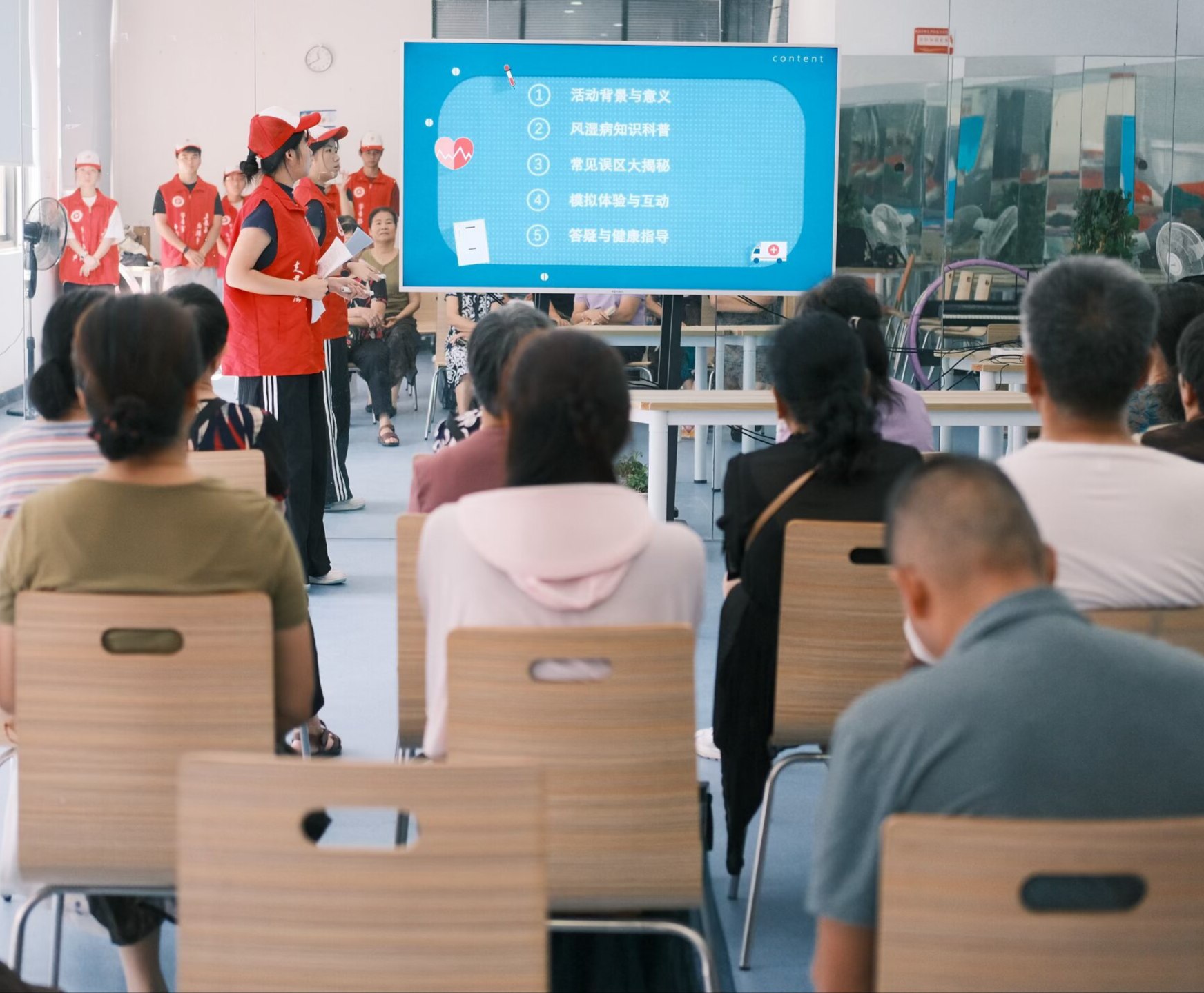 在安堂村村委会,学生志愿者借助生动PPT与动画演示,为居民徐徐揭开风湿病的神秘面纱。“风湿病并非单一病症,而是涵盖类风湿关节炎、骨关节炎、痛风等100余种疾病的统称。”志愿者强调,“如类风湿关节炎若不及早干预,可导致关节不可逆变形甚至残疾。”讲解聚焦日常防治,深入浅出:饮食上需减少高嘌呤食物摄入(如海鲜、浓汤)以预防痛风发作;起居中防潮保暖是关键,尤其注意关节部位;并提醒居民警惕晨僵、关节持续肿痛等危险信号,务必尽早就医。滨海社区活动现场,志愿者还针对久坐上班族及家务繁重的主妇,特别补充了办公室工间操建议与家务劳动中的关节保护技巧。