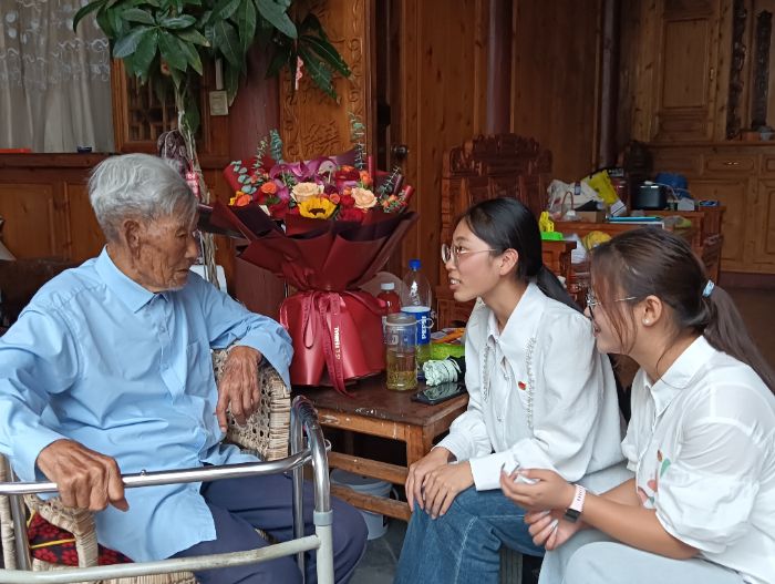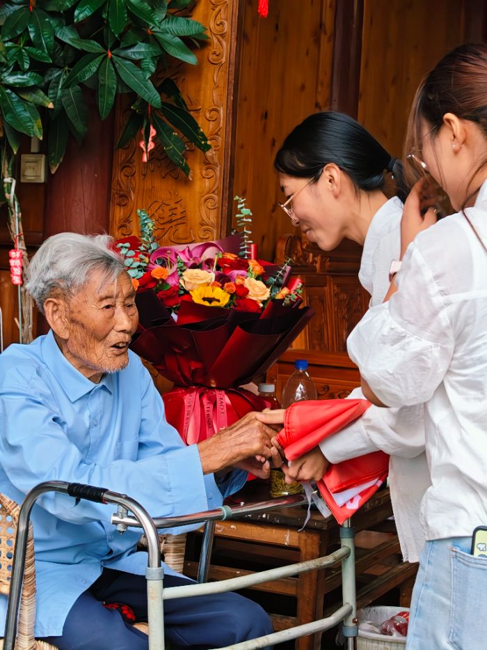7月15日,玉溪师范学院“红色记忆寻访团”成员怀着崇高敬意,携带鲜花与慰问品,拜访了腾冲市一位年逾百岁的抗战老兵。虽历经世纪沧桑,老兵精神矍铄,眼神中透露出岁月淬炼的坚韧。
