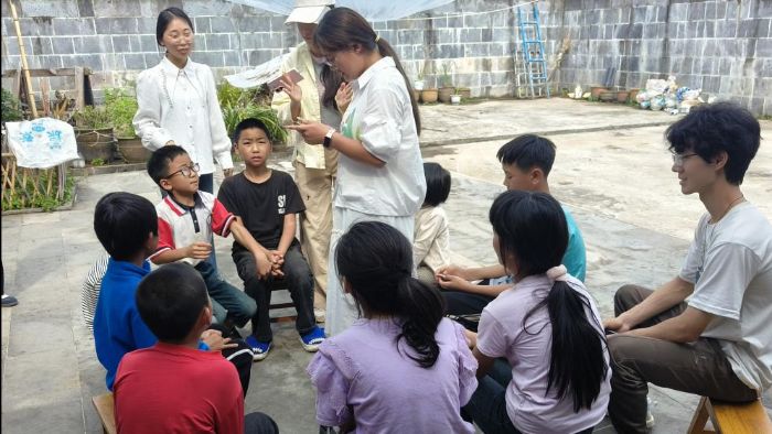 故乡情激荡赤子心,聂耳精神“声”入童心。寻访团成员作为来自聂耳故乡的大学生,对这位伟大音乐家及其不朽杰作《义勇军进行曲》有着深厚情感与传承责任。这份来自血脉和校园的精神烙印,成为他们奔赴千里、开展宣讲的内在动力。当日下午四时,胡家村的活动现场气氛活跃。寻访团成员化身“红色故事讲述者”,设计互动环节:庄严共唱国歌,在激昂旋律中凝聚家国情怀;生动讲述聂耳生平与《义勇军进行曲》诞生历程,将烽火岁月中音乐的力量娓娓道来;趣味知识问答,点燃孩子们探索历史的热情;教唱聂耳经典童谣《卖报歌》,在活泼的旋律中感悟先驱精神。每一个环节,他们都力求用清晰、标准的普通话传递,既是对调研发现的回应,也是推普的生动实践。