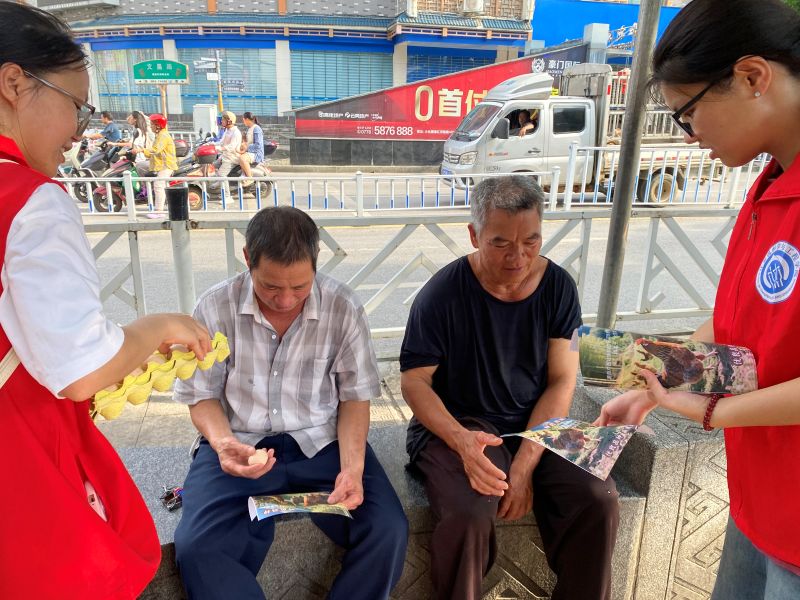 实地考察完成后,团队并未局限于养殖基地,而是思考着怎样让七百弄鸡这类乡土特产被更广泛知晓。经过精心筹备,队员们选定县城人流量较大的街道旁作为宣传点,开展面向普通民众的“科普小课堂”。队员们一边展示七百弄鸡的精美图片和生态养殖的精彩视频,一边讲解其丰富的营养价值和背后蕴含的文化故事,“吃着天然谷物、呼吸清新空气成长,鸡肉鲜嫩多汁”的生动表述引得不少居民停下脚步聆听。为了让大家有更直观的感受,队员们还带来了新鲜的七百弄鸡蛋免费发放,邀请大家品尝。很多群众当场就询问购买的途径,现场氛围十分热烈。通过这种“大学生 + 消费者”的推广模式,团队探索出了“生态养殖 + 科普宣传”的产业发展新路径,让更多人了解并信赖七百弄鸡这一乡土特色品牌。