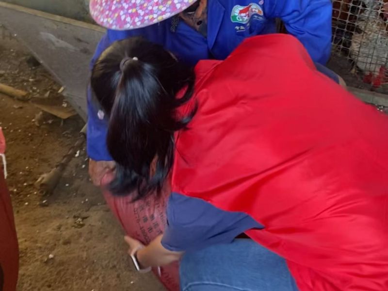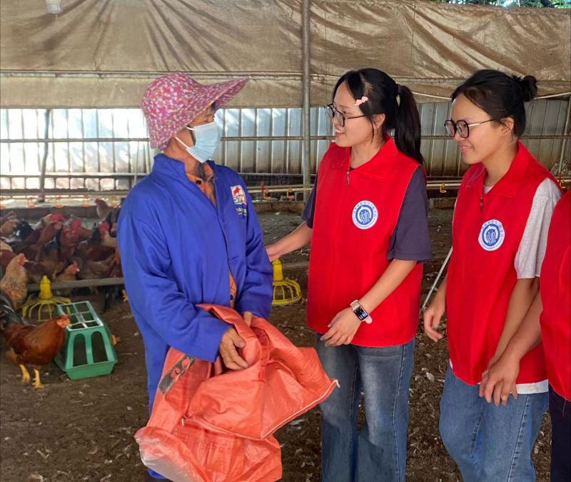 紧接着,在准备投喂的时刻,队员们主动围拢过来,协助养殖人员开启装满饲料的红色编织袋。大家专注看着养殖人员演示开袋、取料的动作,认真学习投喂的技巧 。随着饲料被洒出,鸡群纷纷靠近,队员们脸上浮现出笑意,也切实体会到养殖工作日复一日的辛劳与养殖户默默的坚守。这次亲身实践,让队员们更深刻领悟 “实干兴农” 的内涵,纷纷表态要将专业所学融入乡土发展实际,以行动助力乡村振兴。