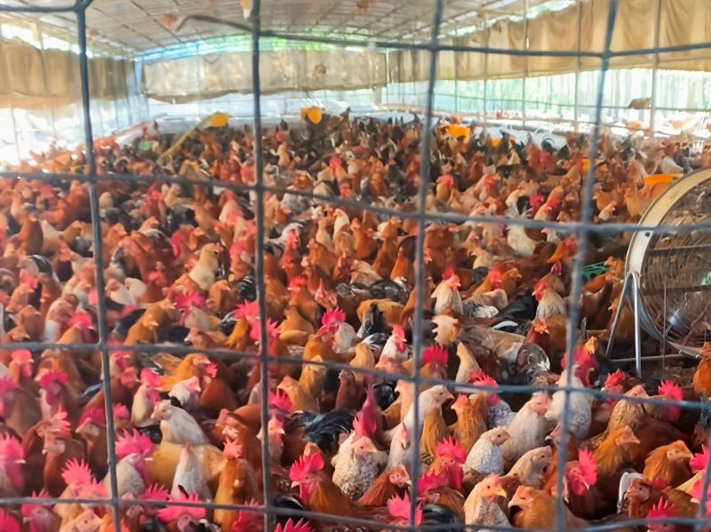 在这个养殖场里,密密麻麻的鸡群被安置在一个相对封闭的空间内,这种集中化的养殖模式,方便对鸡群进行统一的管理,比如投喂饲料、清理场地等操作都能更高效地开展,有助于提高养殖的效率。