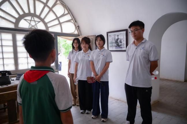 走到居住区,“毛泽东、周恩来、刘少奇、朱德、任弼时”中央五大书记的铜像昂首阔步,阳光洒在他们脸上,似能看见当年意气风发的模样。不远处的窑洞,虽历经整修,却留存着伟人气息。成员们一边听讲解、一边拿笔记录,循着先辈足迹向窑洞走去。讲解员动情地讲述道:“毛泽东居住期间,在此写下《论联合政府》、《关于重庆谈判》、《组织起来》等28篇指导中国革命的重要文章,以其高瞻远瞩的视野、实事求是的态度、人民至上的理念,成为中国共产党在关键历史时期的行动指南,激励着中华儿女为实现中华民族伟大复兴而不懈奋斗。”随后,成员杨亦乔凝视着毛主席的小炕桌说:“看着这里,毛主席借着油灯一笔一画勾勒国家未来的样子已经在我脑海中浮现出来了,我们生活在和平年代,更要珍惜这来之不易的幸福啊!”
