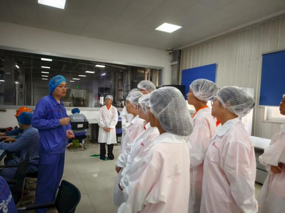 生产车间参观环节,实践团成员在吴丽萍主管的组织下,严格遵循卫生规范,穿戴好工作服、帽子、鞋套,踏入现代化生产场景。车间内,自动化发酵罐精准调控温度、溶氧等参数,智能分离设备高效完成固液分离,干燥、包装环节全流程自动化运作。吴主管全程同步讲解:从原料筛选、菌种培育,到发酵、精制、成品检测,每一步都融入科技智慧与质量管控。“我们通过数字化系统实时监控生产,确保每一批酵母品质稳定。”她的介绍,让成员们切实领略到工业4.0时代的生产精度,折服于企业智能制造实力。
