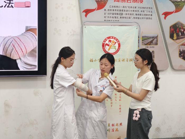 急救知识宣讲,医学院实践队队员连梦瑶首先聚焦绷带包扎技能。她针对日常创伤场景,结合真实案例,系统演示包扎步骤与操作要点,细致解答村民对伤口处理的困惑,并邀请村民现场模拟实践。在实践队员一对一指导下,将复杂的急救知识转化为易于掌握的实用本领。