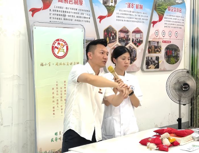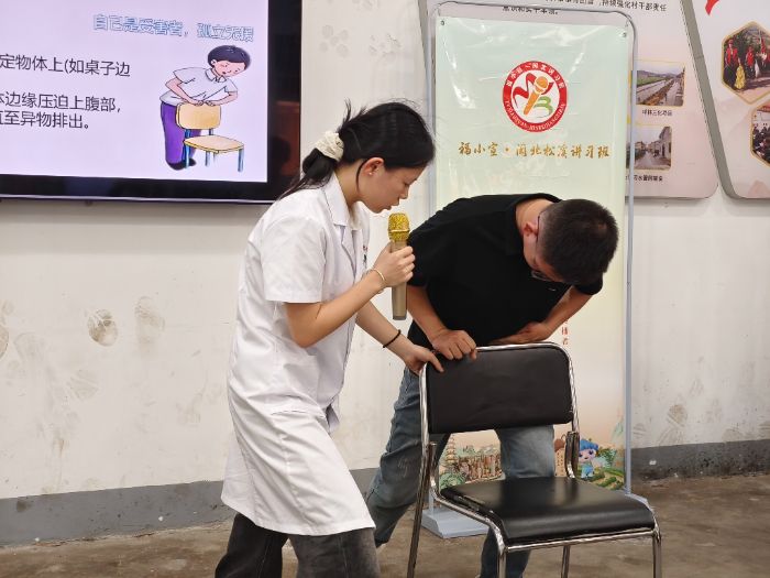 随后,连梦瑶同学生动演示海姆立克急救法。围绕异物梗阻的紧急状况,她借助道具,规范演示腹部冲击等核心动作,组织村民开展互动实操,通过即时纠正发力角度与操作偏差,让这项守护生命的"黄金技能"真正内化于心,成为村民随时能够本能调用的生命守护屏障。