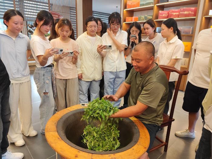 杀青灶前,医学院实践队在何师傅指导下学技。“高温快炒,均匀翻动”,何师傅边示范边讲解。队员们实操时,从火候失当到掌握翻炒节奏,渐入佳境。揉捻环节,大家遵循“刚柔并济”要领,让茶青在掌心成型;烘焙阶段,守着炭火精准控温,使茶香于文火中凝练。一道道工序实践,皆是对松溪制茶匠心的深度传承。