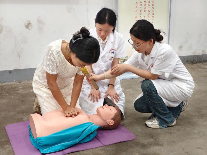 在最后的心肺复苏教学环节中,连梦瑶同学针对心跳呼吸骤停的危急情形,详细阐释按压部位、频率及通气要点,通过标准示范与实操练习相结合的方式,及时纠正动作偏差,着重强调"黄金4分钟"的施救关键,切实为乡村筑牢生命急救防线。