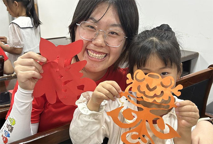 咔嚓!剪纸里藏着的非遗小秘密 作为中国民间传统艺术,剪纸以剪刀为工具勾勒万千意象。志愿者示范对称构图、镂空技巧后,孩子们手持剪刀在红纸上小心创作,从简单的五角星、窗花到可爱的小动物,每一幅作品都凝聚着巧思,完成时的欢呼声响彻课堂,让孩子们真切感受非遗技艺的灵动。