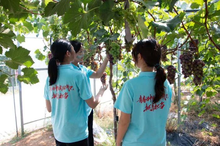23日下午,实践团走进小岗村匠心葡萄园。远远望去,连片的葡萄架如绿色长廊,紫红色的夏黑、翠绿的阳光玫瑰挂满枝头,空气中弥漫着清甜的果香。负责人向成员们展示葡萄的果径、甜度、色泽,它们都有严格的指标,达标产品才能贴上品牌标签。实践团成员在笔记本上认真记录着,“要控产提质,用科学方法提高附加值。”负责人介绍到,“现在通过冷链物流,葡萄能送到全国,这就是小岗敢为人先精神在新时代的体现,我们不只埋头种地,更要抬头看市场。”