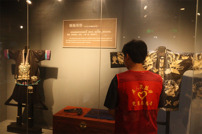 向前的民俗展区更显生动。玻璃柜里并排放着三件不同时期的儿童银帽:明代的银帽上缀着8只银虎,虎爪紧握银球,据说能“镇住邪祟”;民国的银帽添加了珐琅彩,帽檐处的“五毒纹”用红、蓝两色点缀,显得格外鲜活;而现代的银帽则融入了卡通元素,银片上錾刻的小熊图案旁,仍保留着传统的“长命锁”吊坠。“你看这三件帽顶的银佛,姿势从没变过,这是咱侗族银饰的根。”吴阿姨的手指在展柜上轻轻划过。