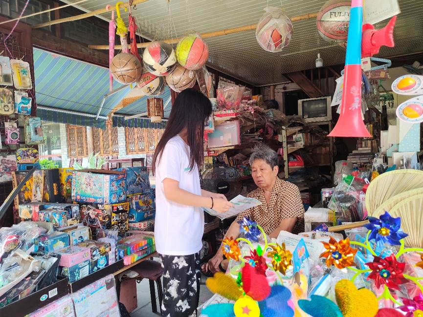 从革命旧址出来后,学生们将红色精神内化于心、外化于行,在周边商铺和街道开展食品安全科普宣讲。他们带着精心制作的宣传海报和手册,向商户和过往群众讲解夏季食品储存要点、如何辨别过期食品等知识。面对商户提出的“自家腌的咸菜能放多久”“剩菜怎么加热才安全”等问题,学生们耐心解答。此次宣讲覆盖了40多家商户和100多位群众,不仅提高了大家的食品安全意识,也让学生们在实践中传承了红色基因,深刻体会到了作为新时代青年的责任与担当。