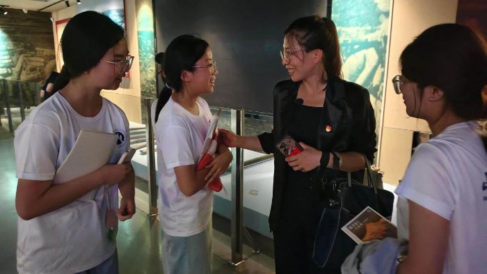 图3团队对孟良崮纪念馆讲解员进行采访 通讯员贾思雨摄